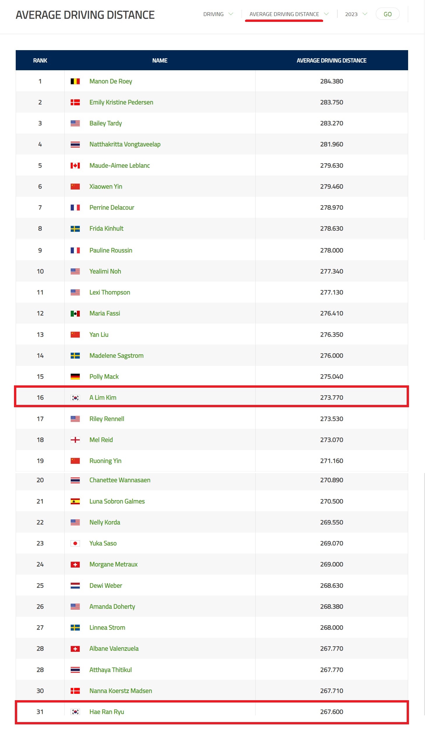 미국 LPGA 평균 드라이버 비거리 순위입니다. 2023년. 확실히 예전에 비해 한국낭자들의 위상이 떨어진 것 같긴 하네요. 또 어찌보면 드라이버 비거리 보다 샷의 정확도와 퍼팅 등에서 더 경쟁력이 있었던 것이기도 하지만요.. 하기 도표는 LPGA 평균 드라이버 비거리 순위입니다. 역시 장타자로 유명한 김아림 답게 273.8야드를 기록하고 16위에 올랐네요. 류해란 프로는 367.6야드로 31위에 랭크되어 있습니다. 미국 골프코스의 전장이 갈수록 길어져서 장타자일수록 유리하다고 하네요. 그런 이유로 한국 선수들이 부진하다고 분석하는 전문가도 있더라구요. 다음은 드라이버 정확도 순위입니다. 페어웨이 안착률 순위에는 그래도 여러 명이 랭크되어 있네요. 89.3%의 5위 김인경 선수, 88.1%의 8위 이정은..